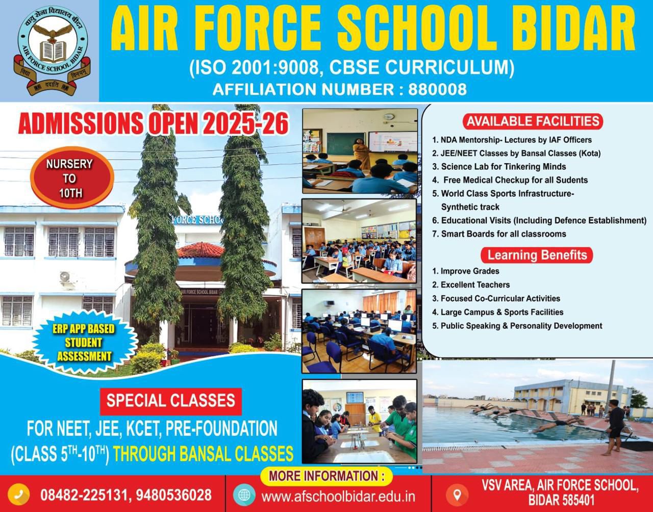 Air Force School Bidar was established in 1967. In the year 1975 Kendriya Vidyalaya, Bidar came into being by adopting class I to VII of the existing Air Force School Bidar. Hence, Air Force School made a fresh beginning in 1975 as a Pre-Primary School with strength of 100 students 04 teachers. Over the years the school has grown and as on date caters to schooling needs of 800 students from LKG to Class X. This school bagged the Best school award in IAF in the year 1999, ‘Second Best’ in the years 2000 under Training Command and ‘Third Best’ in the year 2001 under Training Command.