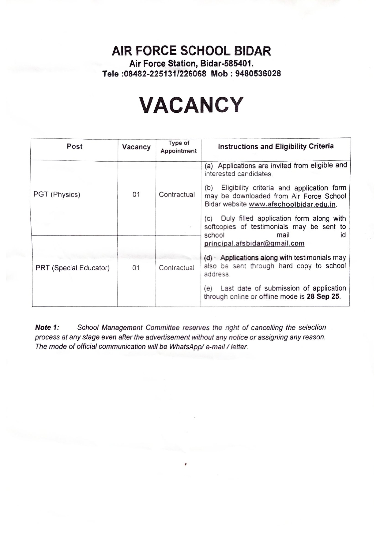Download Application Form by the link given below and submit to the following address Air Force School Bidar VSV Area, Air Force Station Bidar,Karnataka 585401